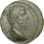 Asclepius standing, facing, head, left, holding serpent-staff |