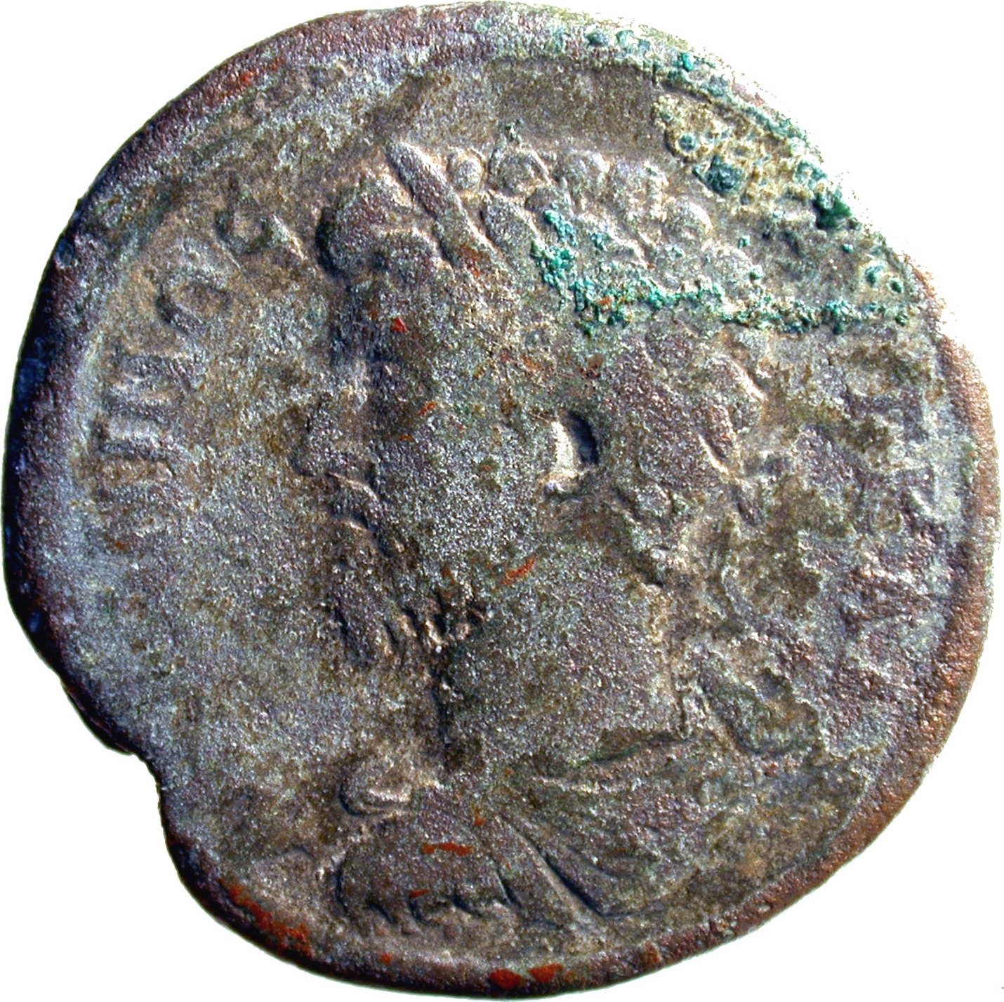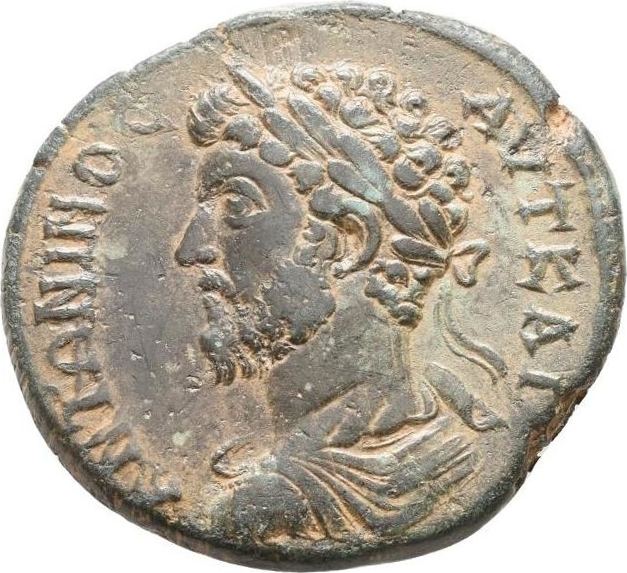 laureate-headed bust of Marcus Aurelius wearing cuirass and paludamentum, left