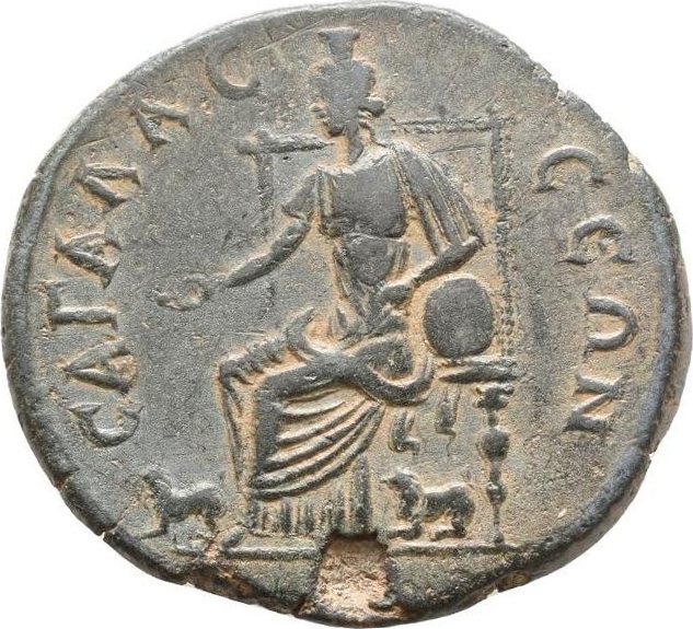 Cybele seated, left, wearing kalathos, holding patera, resting arm on tympanum; between two seated lions