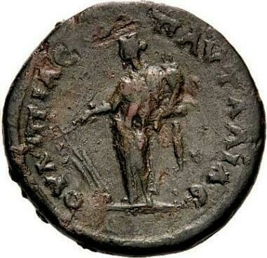 Tyche standing, left, wearing kalathos, holding rudder and cornucopia