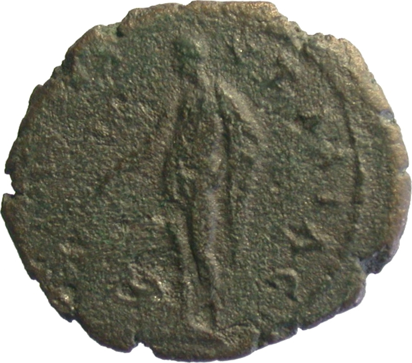 nude Apollo standing, left, having chlamys over shoulder, resting left hand on hip, holding laurel-branch(?) over altar(?)