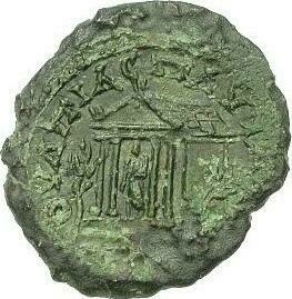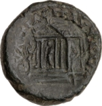 temple with four columns in perspective enclosing statue of Asclepius standing, facing, holding serpent-staff; temple between two trees
