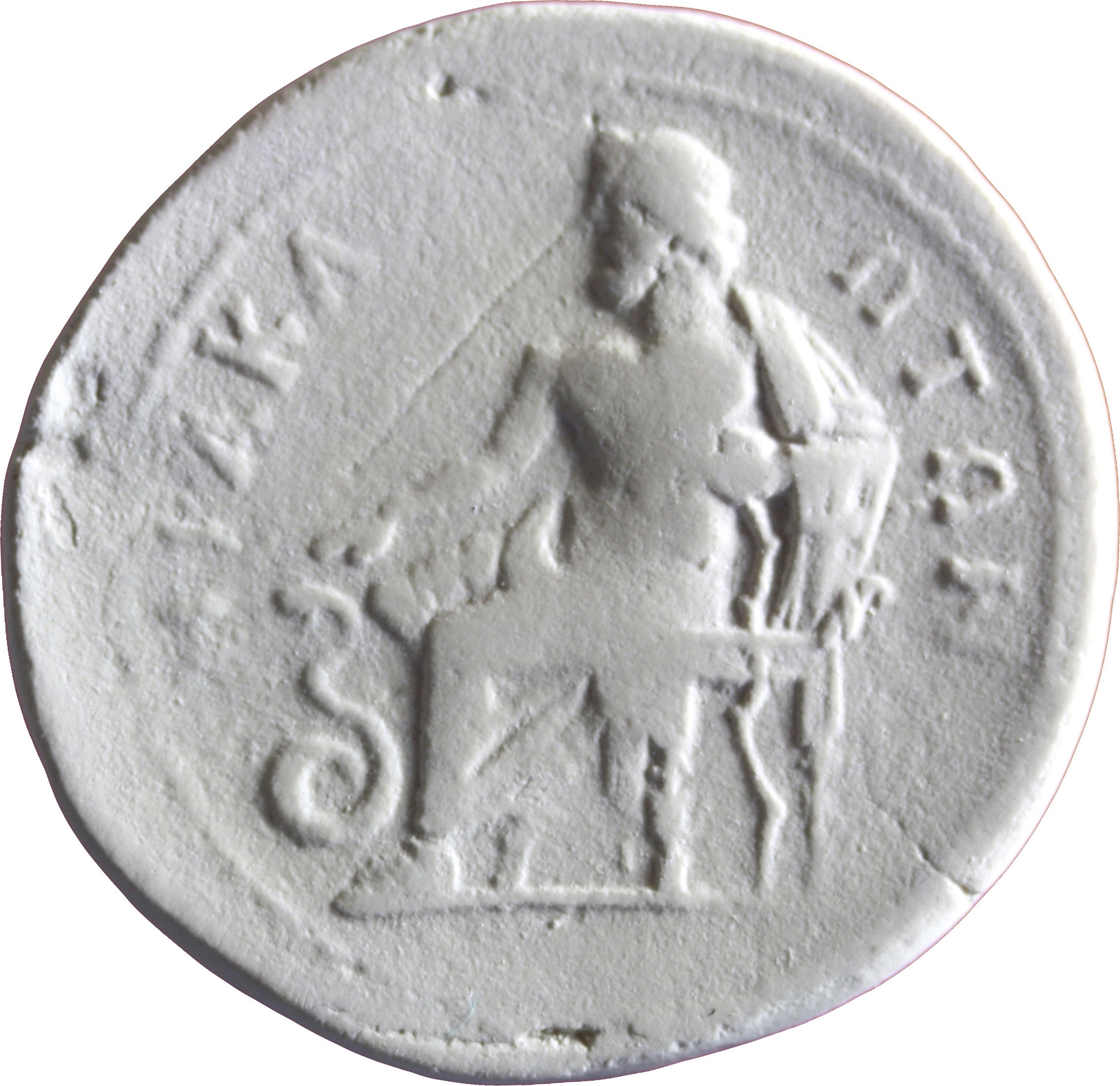 Asclepius seated, left, feeding serpent from patera, holding staff