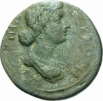 turreted and draped bust of Nymph Nicaea wearing ivy wreath, right, having quiver at shoulder; to right, bow(?)