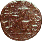 nude Hermes seated rock, left, holding caduceus, resting arm on rock, resting foot on uncertain object
