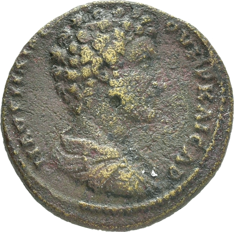 bare-headed bust of Marcus Aurelius (short beard) wearing cuirass and paludamentum, right, seen from rear