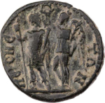 to left, emperor (Marcus Aurelius) standing, facing, head, right, wearing military dress, holding spear, sword and paludamentum; to right, Nike standing, left, crowning emperor, holding palm-branch