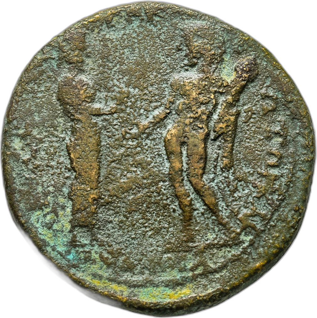 to left, Zeus of Laodicea standing, right, holding long sceptre and eagle; to nude Heracles (bearded) standing, left, holding club and lion skin; both clasping hands