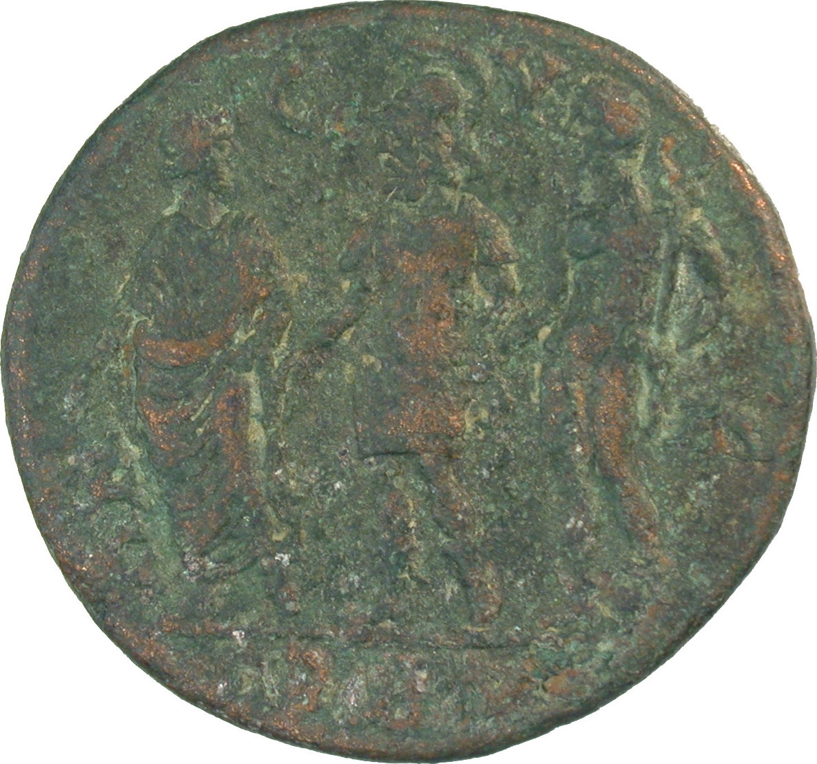 in centre, Ares standing, facing; to left, Dike standing, facing, head., right; to right, nude Hermes standing, left, holding caduceus