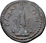 cult statue of Samian Hera standing on wide base, facing, wearing kalathos, holding patera in each hand, having fillets; between two peacocks