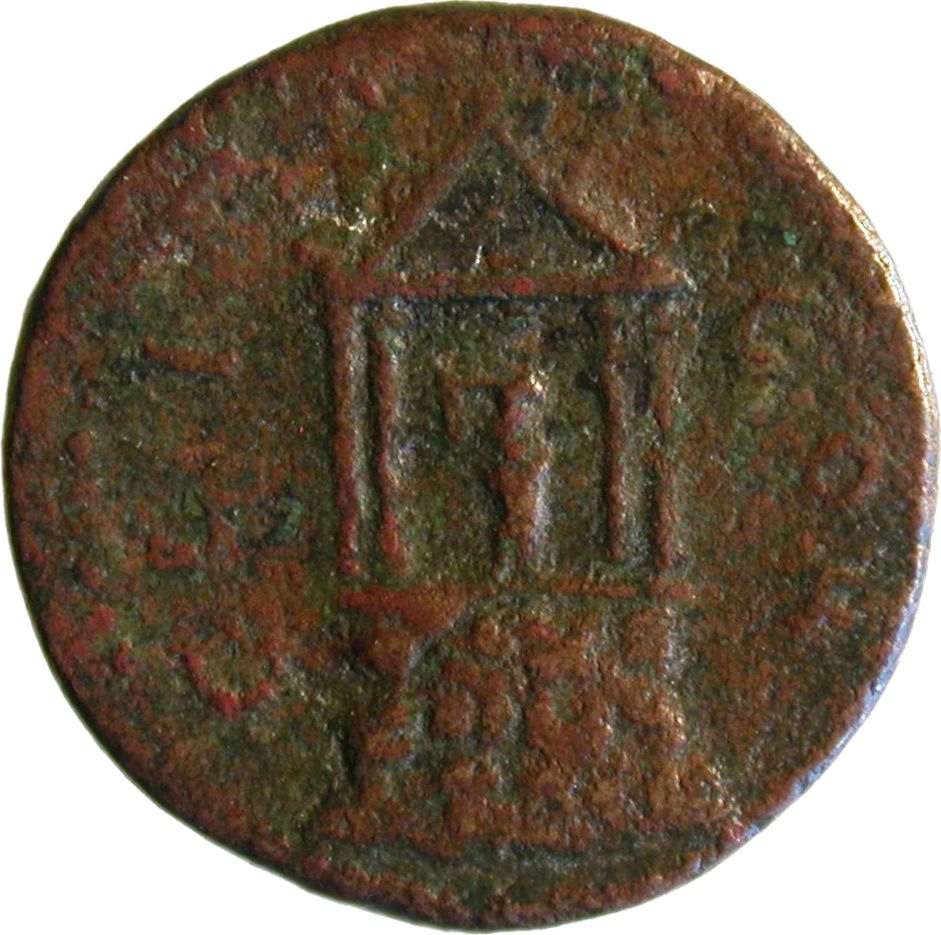 temple of Venus/Aphrodite with two columns on summit of Acrocorinthus enclosing statue of goddess standing, left, holding Mars/Ares' shield before her as mirror
