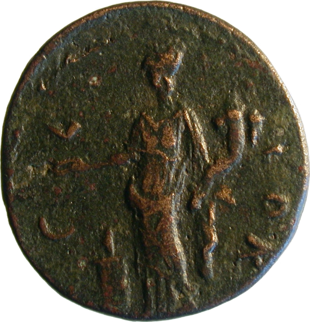 turreted Concordia/Homonoia (or Fortuna/Tyche?) standing, left, holding patera over altar and cornucopia