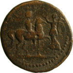 to left, emperor on horseback, right; to left, Victoria/Nike advancing, left, holding wreath and palm-branch