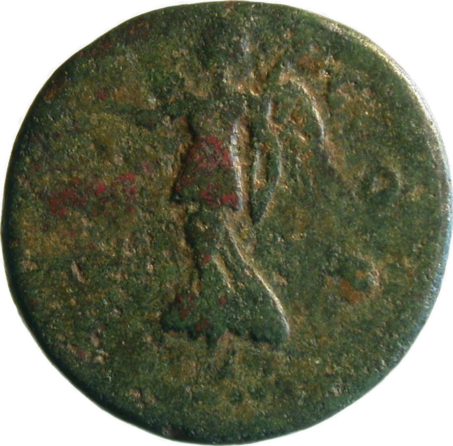 Victoria/Nike advancing, left, holding wreath and palm-branch