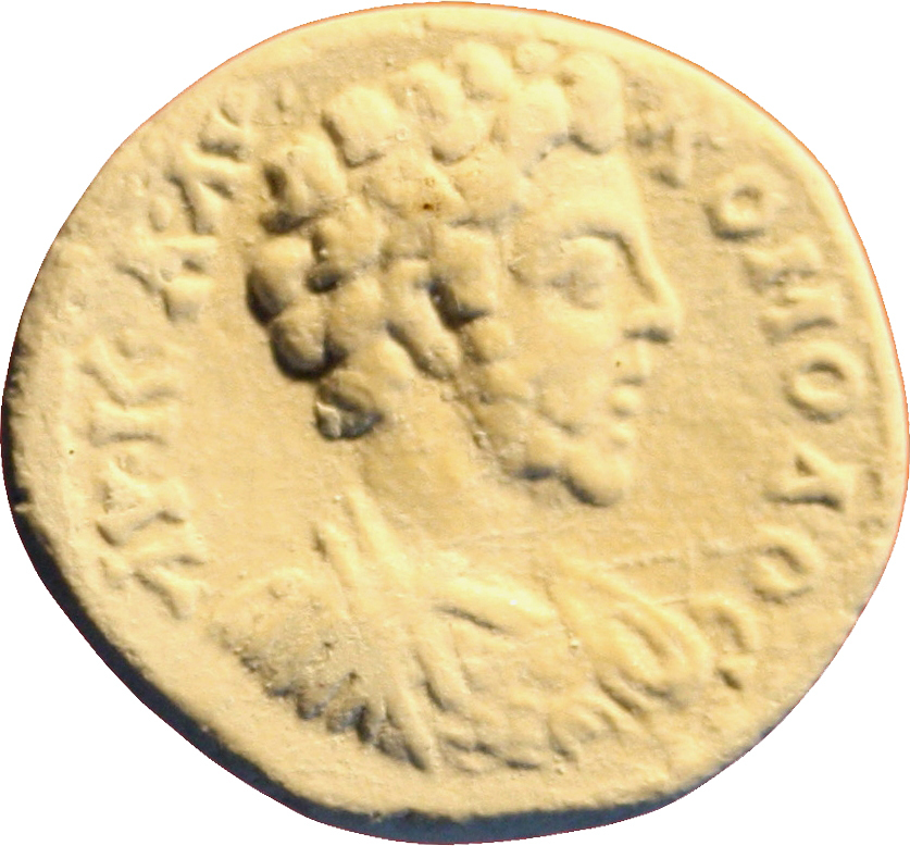 bare-headed bust of Commodus wearing cuirass and paludamentum, right, seen from front
