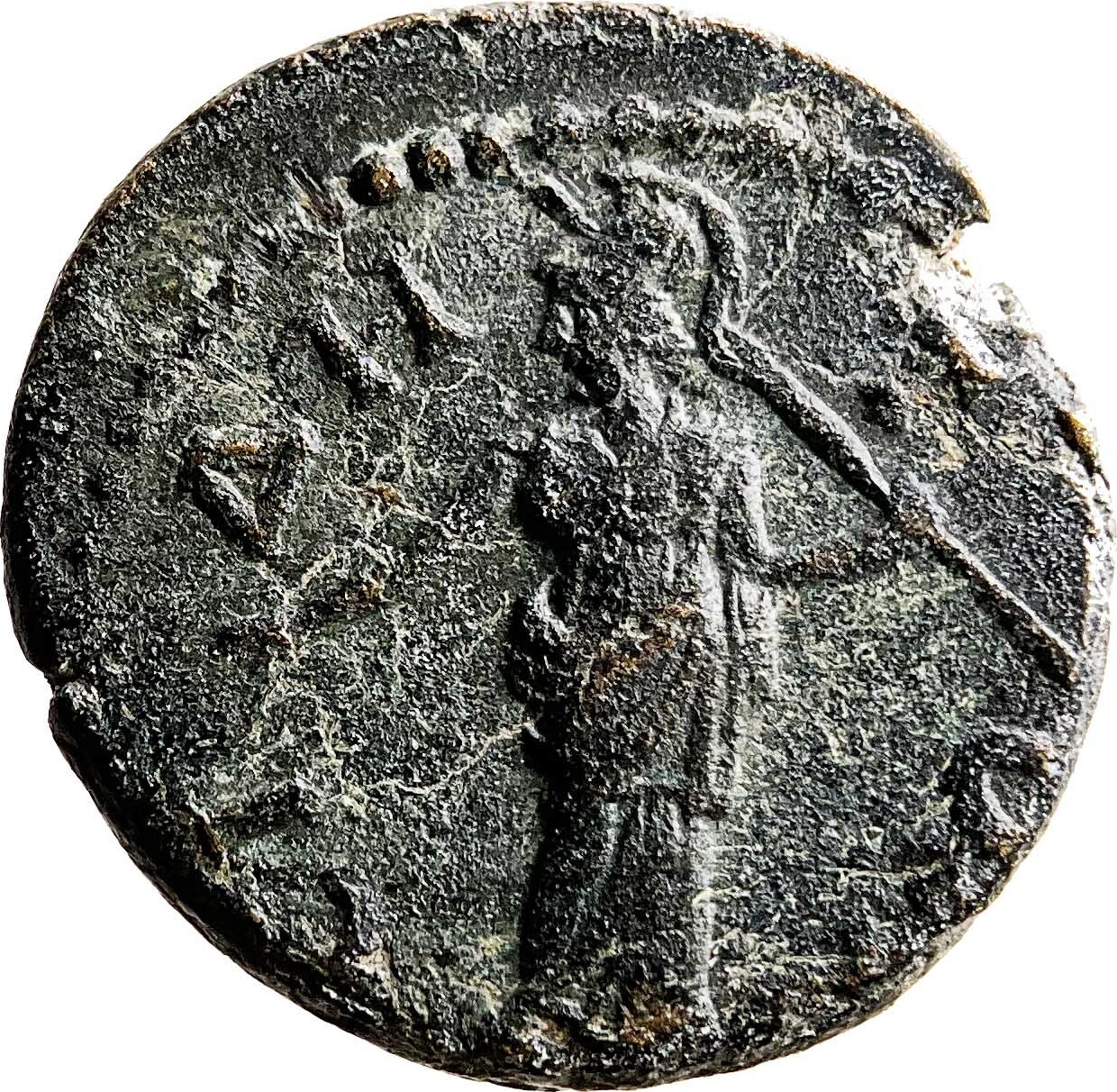 Athena standing, facing, head, left, extending right hand, holding transverse spear