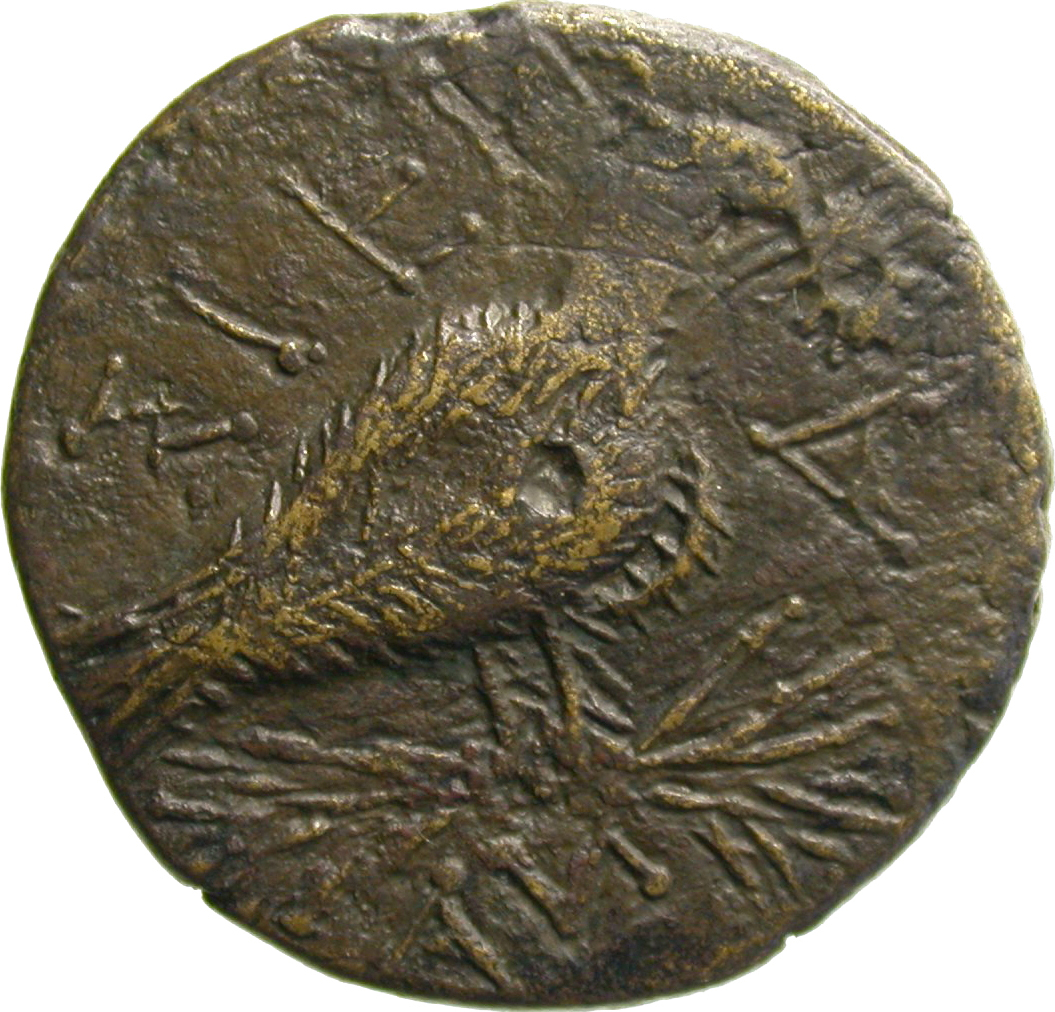 laureate-headed and draped bust of Apollo, right; to right, lyre; beneath neck, dolphin(?)