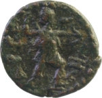 Artemis advancing, right, drawing arrow from quiver at shoulder, holding bow; to right at her feet, dog jumping, right