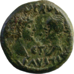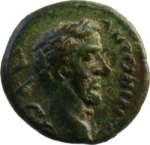 to left, head of Marcus Aurelius (short beard), right; to right, draped bust of Faustina II, left