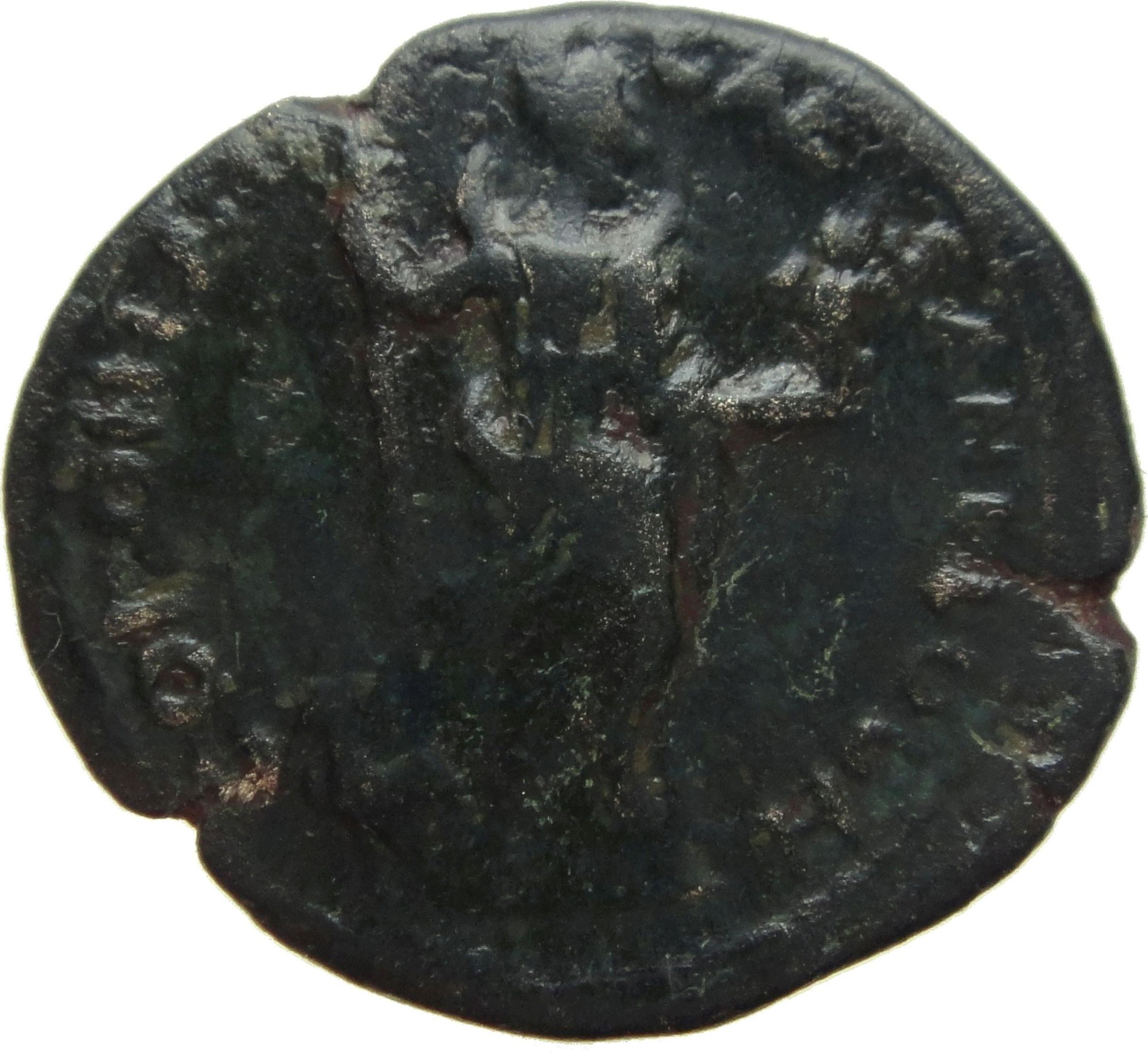 Mên standing with foot on bucranium, facing, head, right, wearing Phrygian cap, holding long sceptre and Victoria/Nike; behind his shoulders, crescent; to left, cock