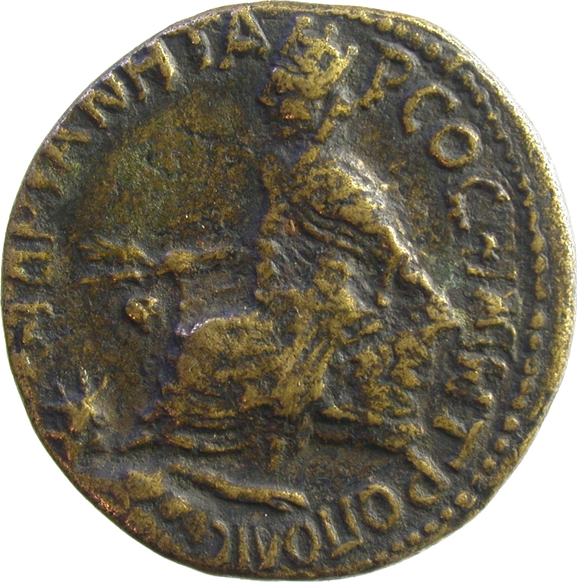 turreted and veiled Tyche seated on rock, left, holding poppy and two ears of corn, resting foot on swimming river-god (Kydnos), wearing sedge |