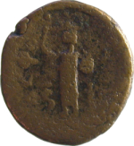 helmeted war-deity Phanebalos standing on short base, left, brandishing harpa, holding shield and palm-branch