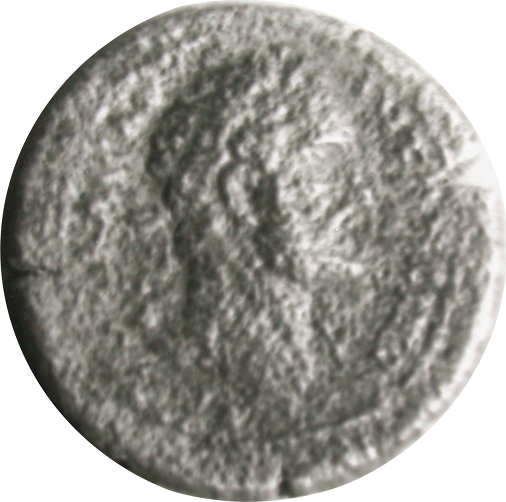nude Poseidon standing, facing, head, left, holding dolphin and trident |