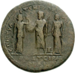 Capitoline Triad: in centre, Zeus (Lydios) standing, left, holding patera and long sceptre; to left, Hera standing, right, holding short uncertain object and long sceptre; to right, Athena standing, left, holding patera over altar, resting left hand on shield |