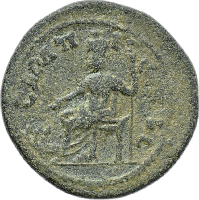 Sarapis seated, left, wearing kalathos, extending arm over Cerberus, holding long sceptre