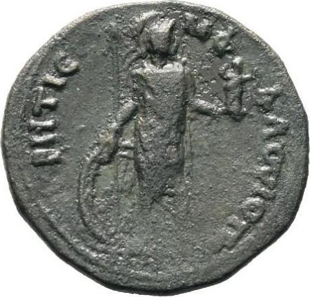 Athena standing facing, head right, holding spear and shield in her right hand and statue on her left