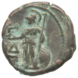Athena standing facing, head left, holding Nike with wreath and inverted spear; at her feet, shield