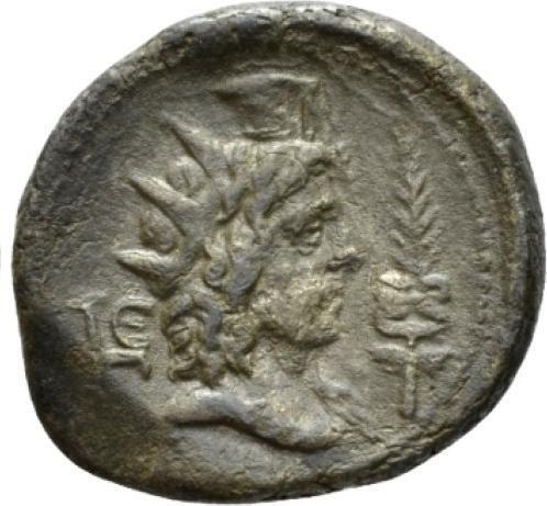 Hermanubis bust right, radiate and wearing kalathos and lotus petal, palm over shoulder; in front, winged caduceus combined with palm branch