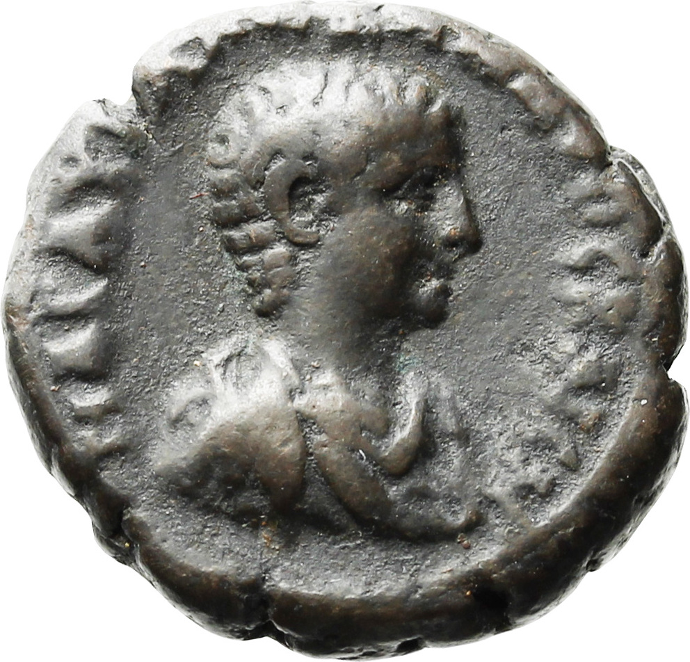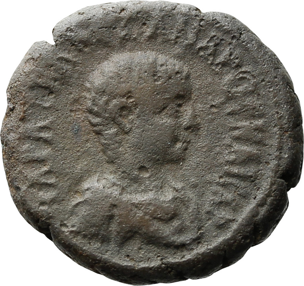 bare-headed, draped and cuirassed bust of Severus Alexander Caesar, right, seen from front |