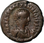 bare-headed, draped and cuirassed bust of Severus Alexander Caesar, right, seen from front |