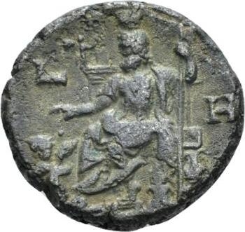 Sarapis seated, left, holding long sceptre and extending right hand over Cerberus sitting at his feet, left; on back of throne, left, little Nike right, holding palm and wreath
