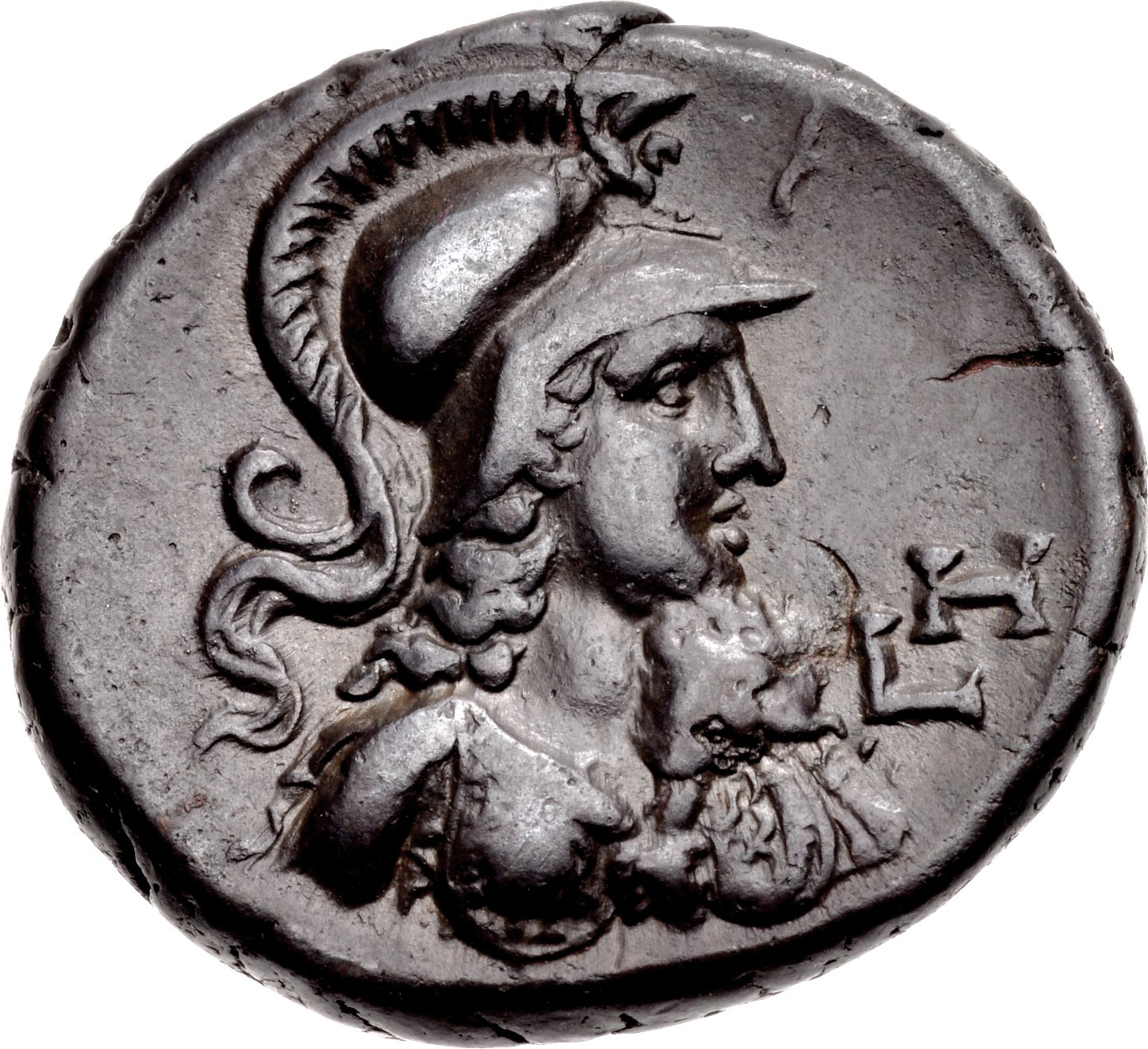Athena bust right, wearing aegis and Corinthian helmet (griffin beneath crest)
