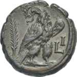 eagle standing right, head left, holding wreath in beak; to left, palm branch