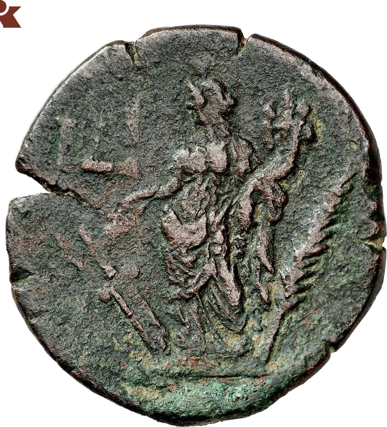 Tyche standing facing, head left, wearing kalathos, holding rudder and cornucopia; to right, palm branch