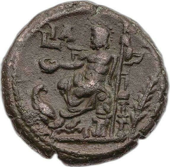 Zeus seated left, on throne, holding patera and long sceptre; at his feet, eagle looking back; behind, palm branch