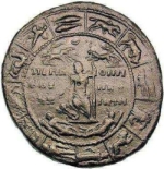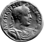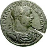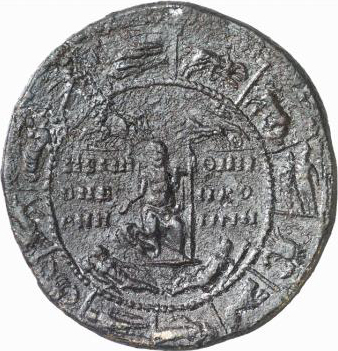 Zeus seated on throne facing, holding patera and long sceptre; at his feet, eagle left, head right; above, Helios in quadriga, right, surmounted by crescent, and Selene in biga drawn by bulls, left, surmounted by star; below, Gaia reclining, right, holding cornucopia, and Thalassa reclining, left, with crab claws on the head, holding rudder and prow at her feet; all around, the signs of the Zodiac in a dotted circle |