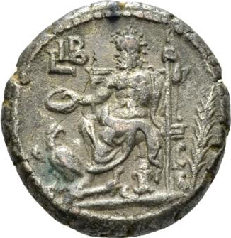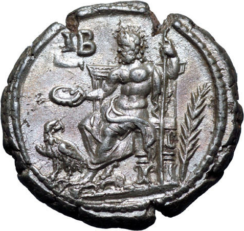 Zeus seated left, on throne, holding patera and long sceptre; at his feet, eagle looking back; behind, palm branch