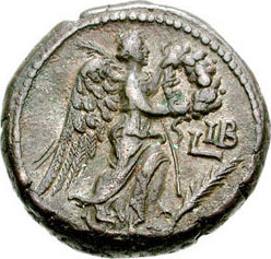 Nike advancing right, holding palm branch and wreath; in front, palm branch
