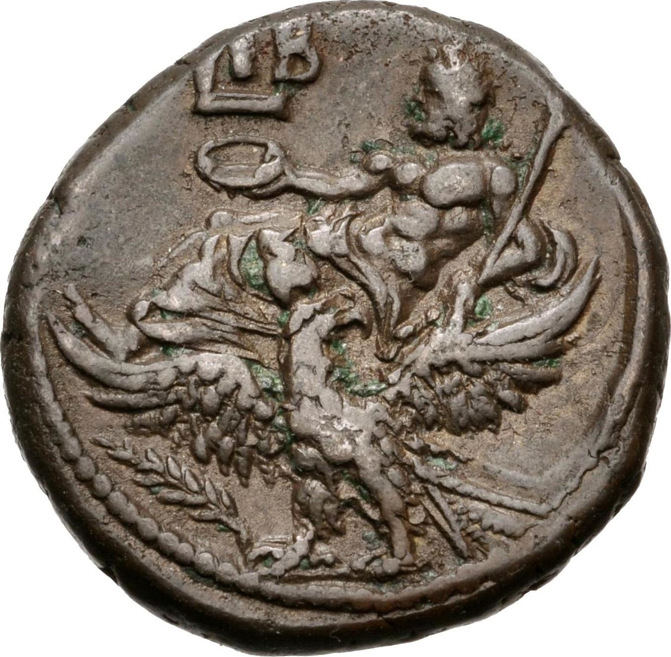 Zeus reclining left, on eagle, holding patera and sceptre; the eagle facing, head right, with spread wings; to left, palm branch