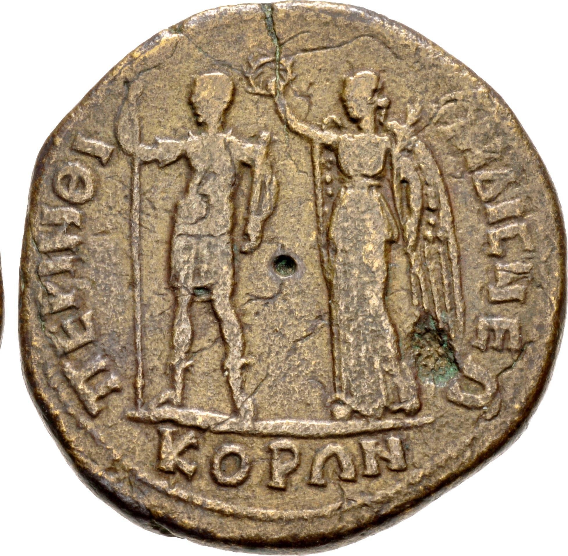 emperor standing facing in military dress, holding parazonium and spear, crowned with wreath by Nike standing, left, holding palm branch