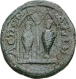 front view of double-pediment temple enclosing statues of Aphroditai Kastnietides