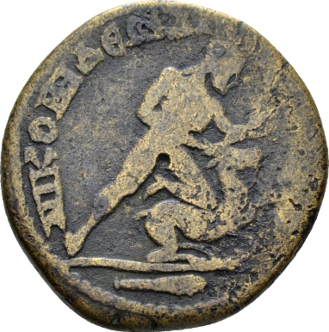Heracles standing, right, placing knee on the Ceryneian hind's back, holding her by antlers; club in exergue