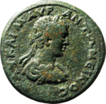 temple with four columns male figure standing right, in a short chiton, holding double axe and spear, two lions (?) at his feet |