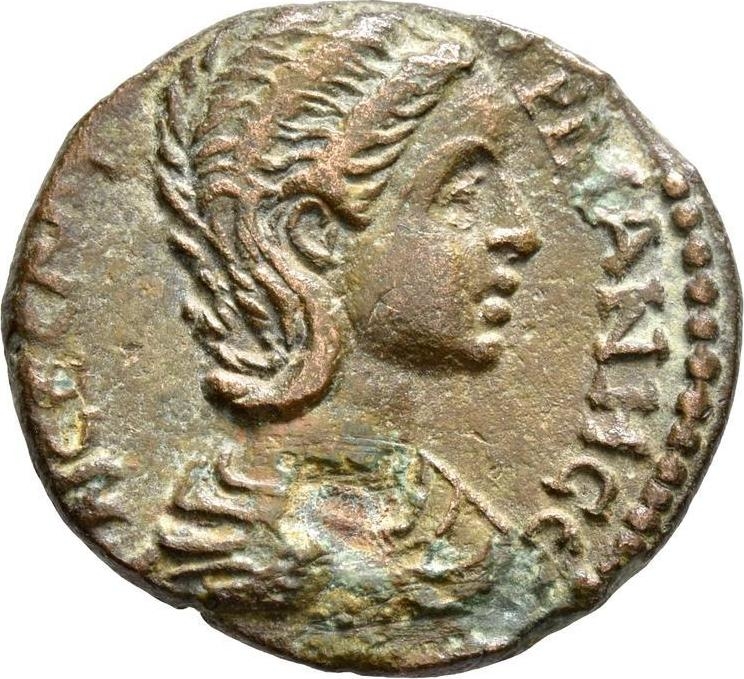 veiled and draped female figure (Nemesis?), holding flower(?) on top of her head, standing facing within aedicula with two columns, head lowered slightly to left, and holding small rod(?); to left, at her feet, griffin seated left, looking up; to right, behind her, wheel; on either sides, crescent and star |