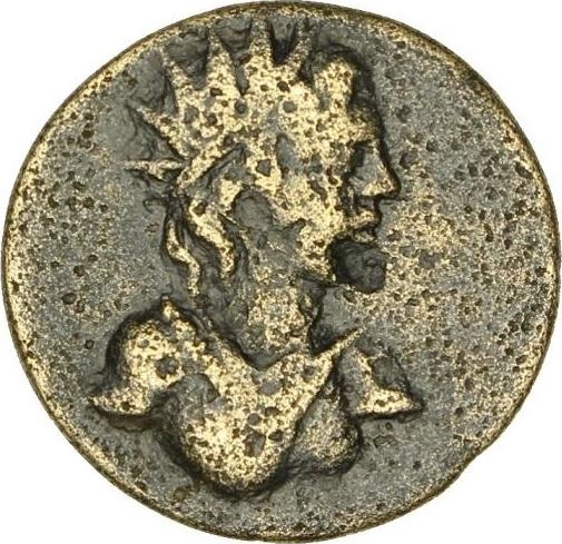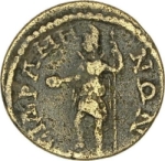 Mên standing facing, head left, placing foot on bucranium, wearing crescent on shoulders, holding pine cone and sceptre