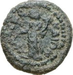 Tyche standing facing, head left, wearing kalathos, holding cornucopia and rudder